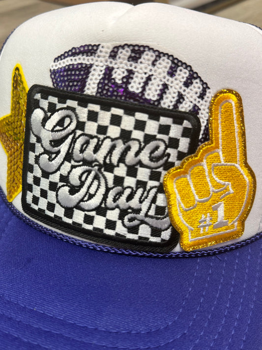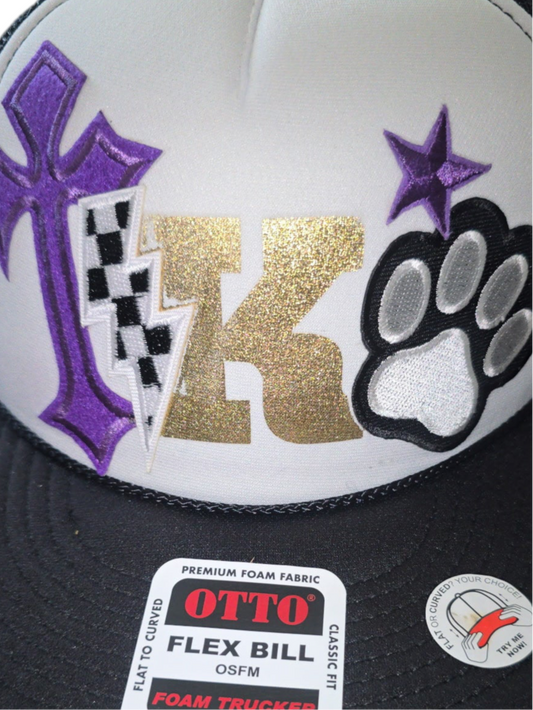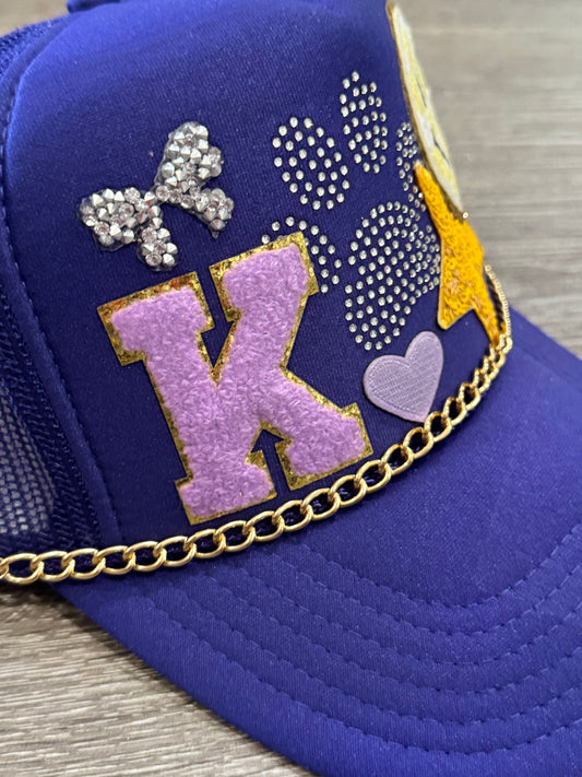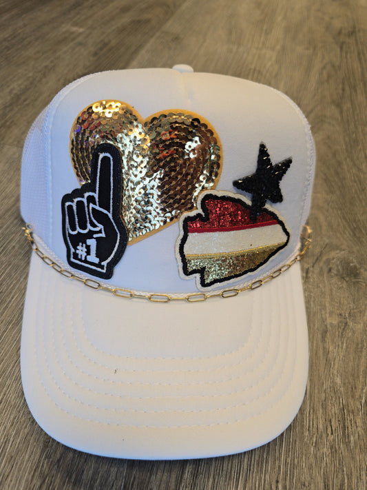 KC Chenille Letters with Sequin Star & Heart Patch Trucker Hat