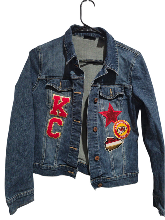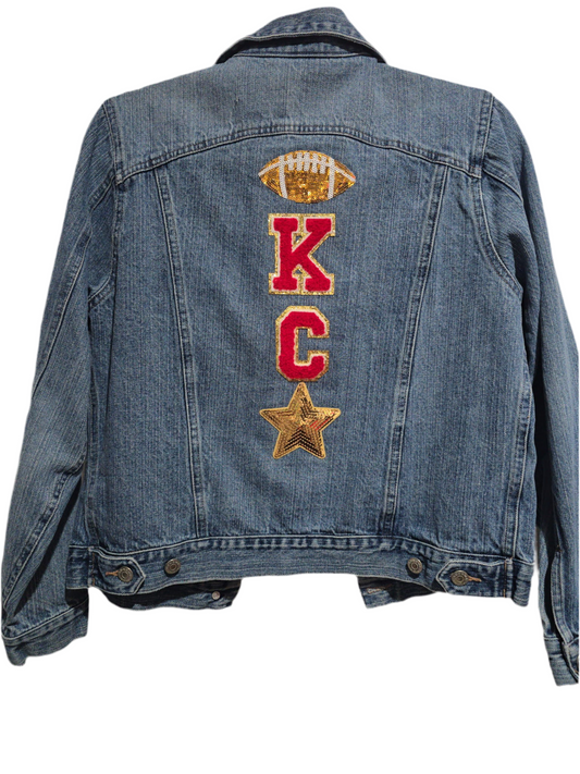 KC Chiefs Chenille Vertical Letters Jean Jacket, M Women’s