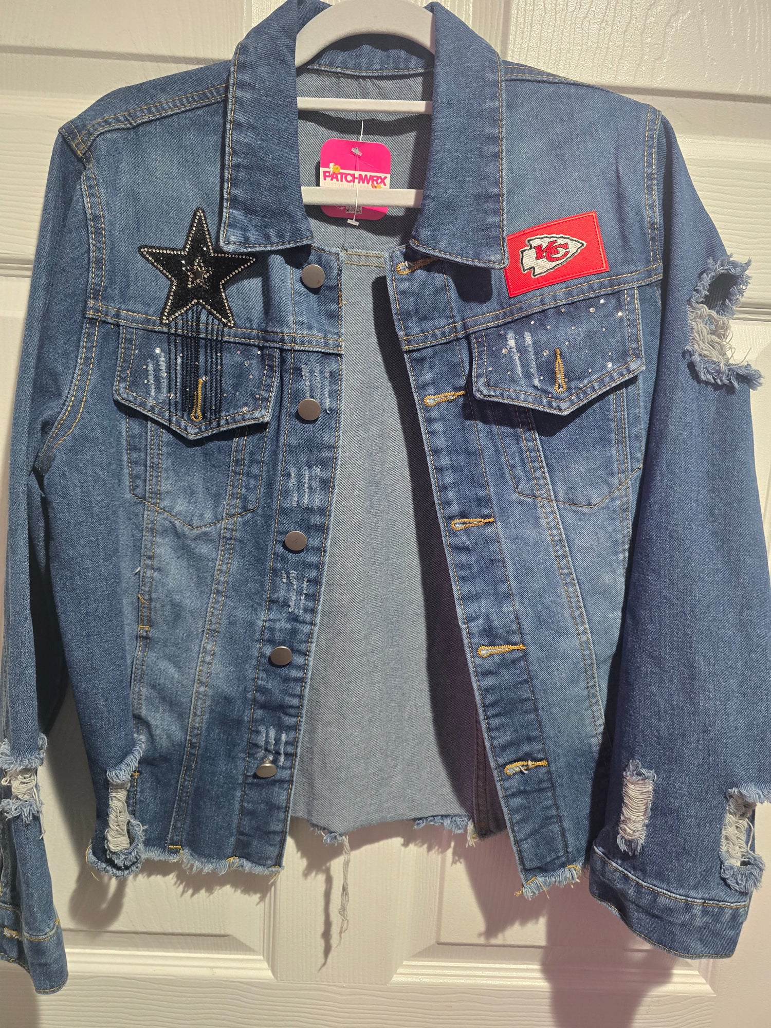 KC Chiefs Chenille Vertical Letters Jean Jacket, M Women’s