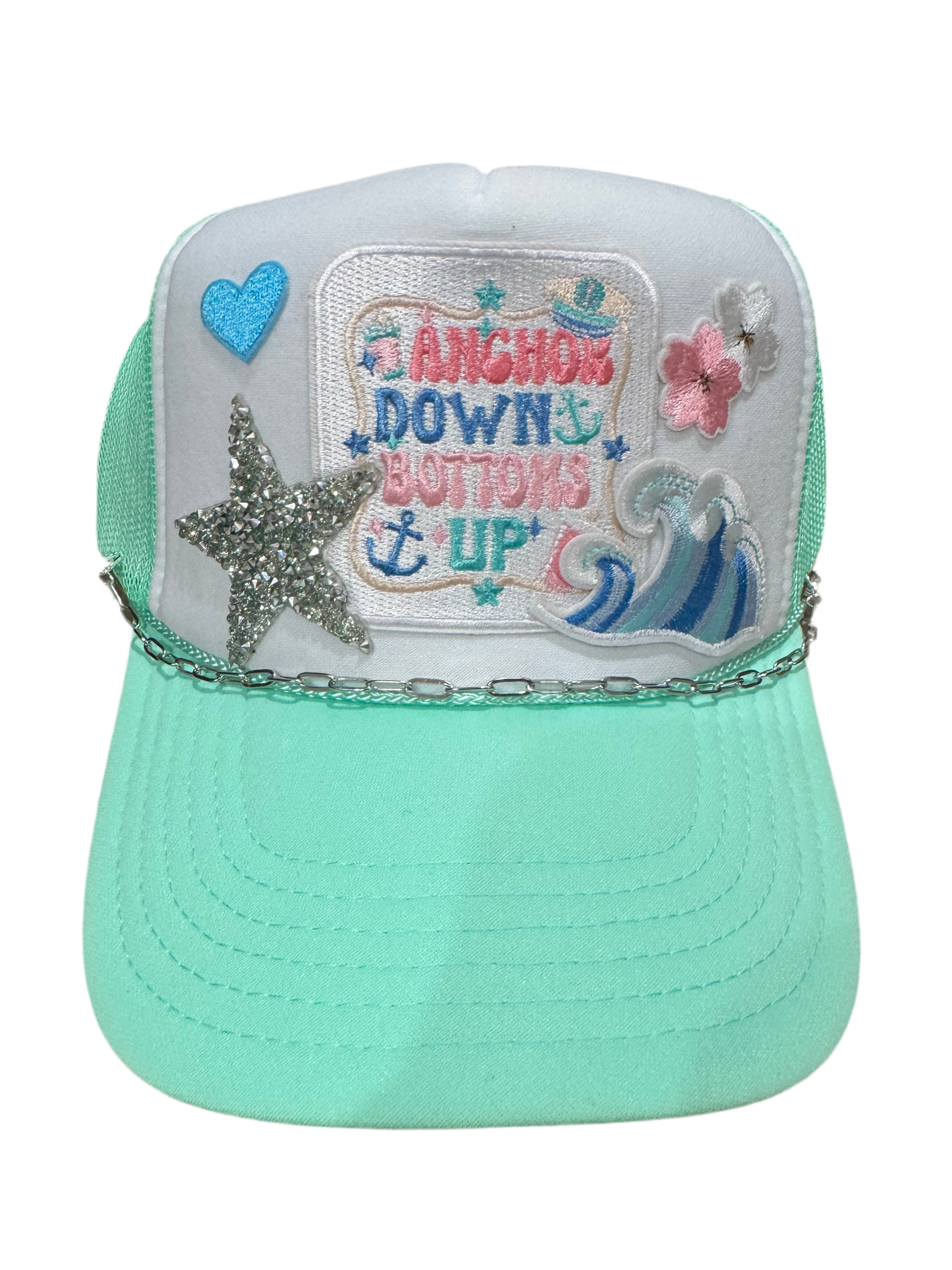 Get ready to set sail with the Anchors Down Bottoms Up Lake Vibes Trucker Hat! Featuring a playful anchor, waves, and flowers patch, this mint trucker hat is adorned with a sparkling rhinestone star and silver chain. Perfect for any lake-lover looking to add some fun to their look!