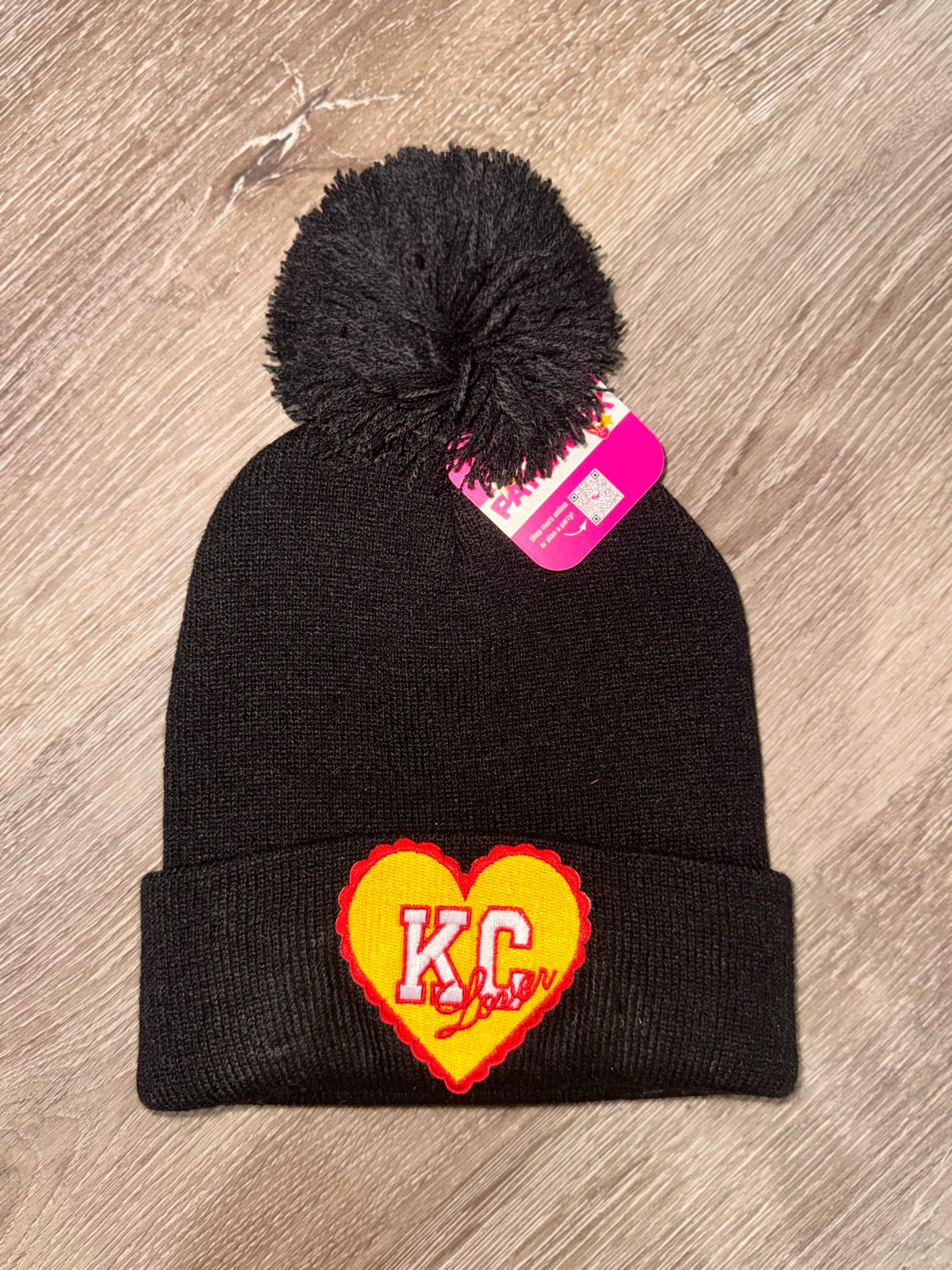 Stay stylish and warm on gameday with this ribbed beanie stocking cap. Available in red or black, featuring a heart patch for our KC lovers. Get ready to rock that KC Chiefs inspired look with a playful pom on top. And because we’re KC natives, of course, Go Chiefs!