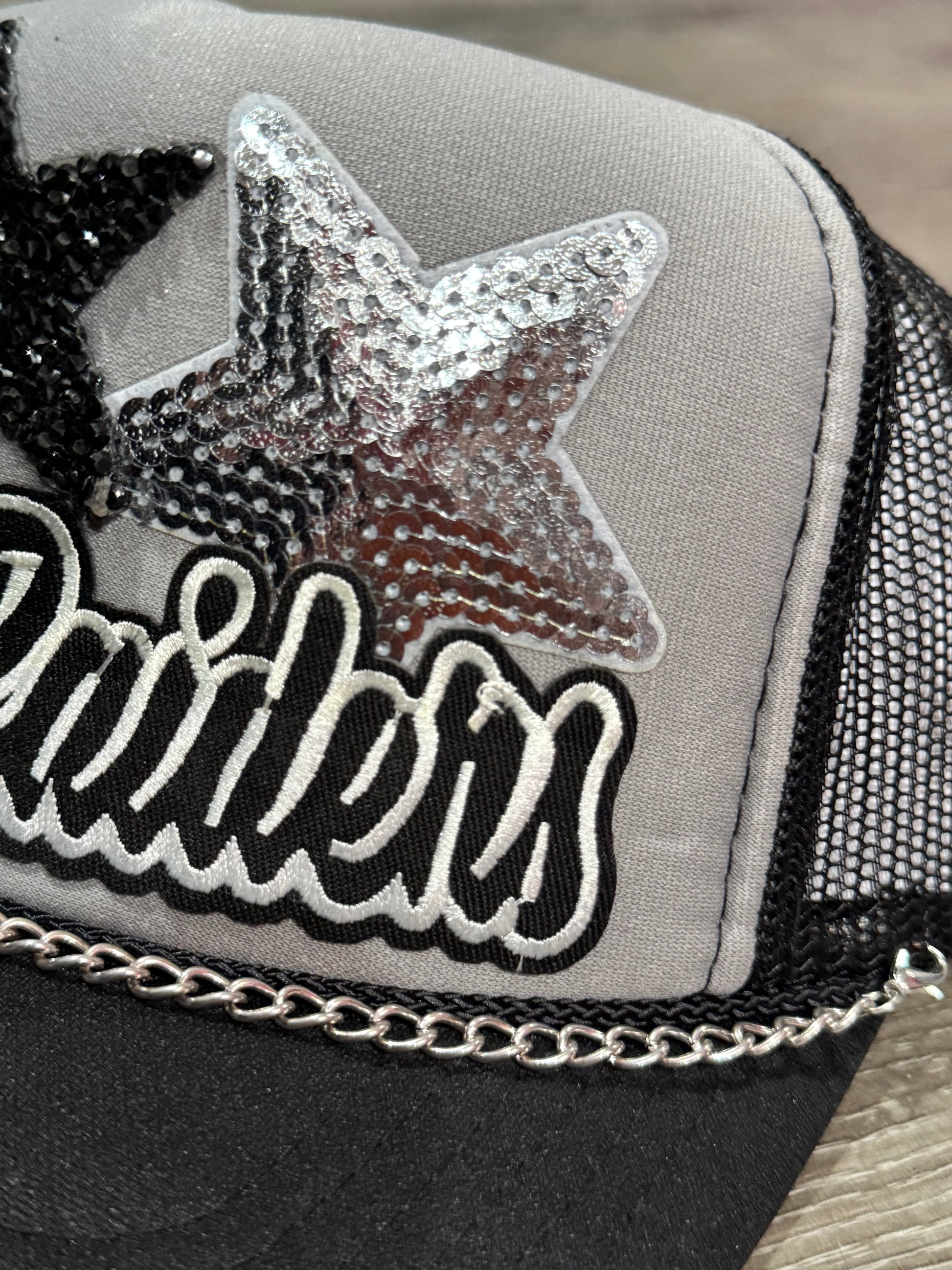 Gear up for game day with the Raiders Lightening Bolt Football Trucker Hat! Show off your team spirit with the Raiders script and stars, while the silver sequin and rhinestone stars add a touch of sparkle. The football lightening bolt patch and silver chain add a bold and adventurous touch to this black and grey Otto trucker hat. Are you ready to take on the competition?!